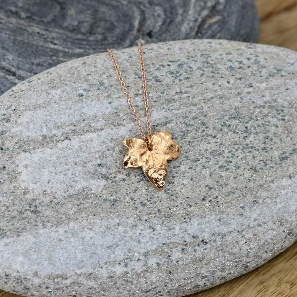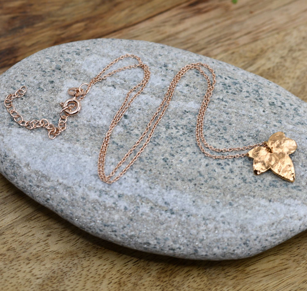 Efeu-Blatt Anhänger gefertigt in Feinsilber und vergoldet rot. Die Anker-Kette ist 40+5cm.