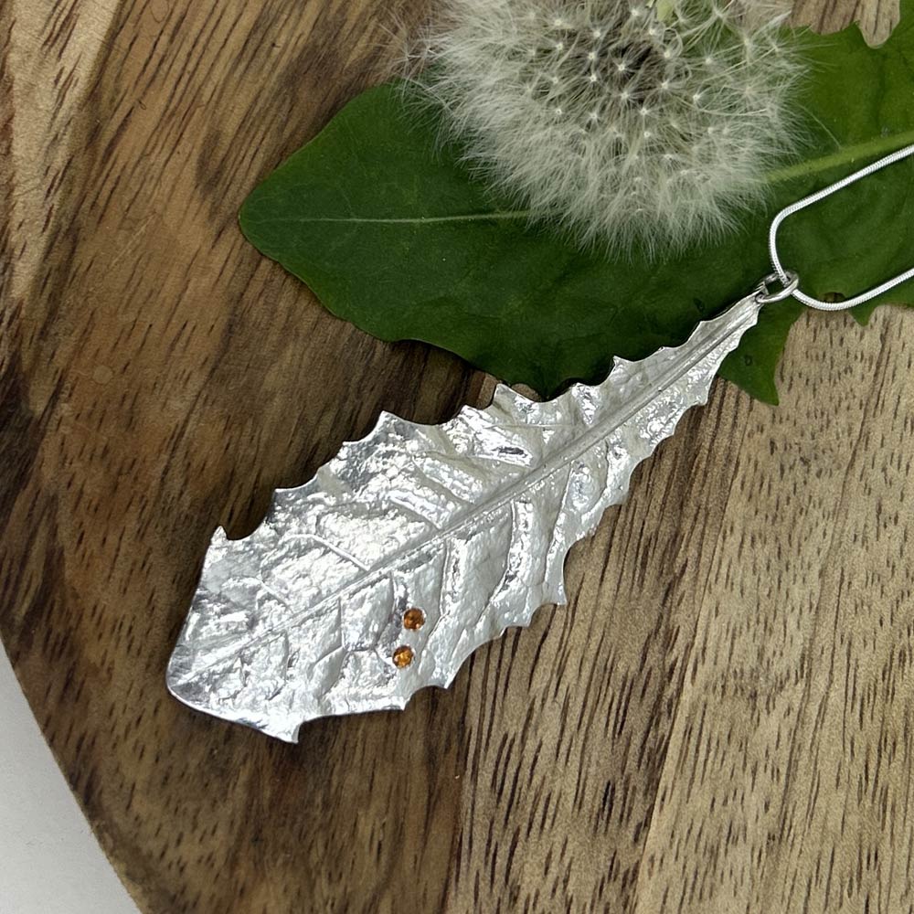Löwenzahn-Blatt Anhänger mit zwei Mandaringranaten.