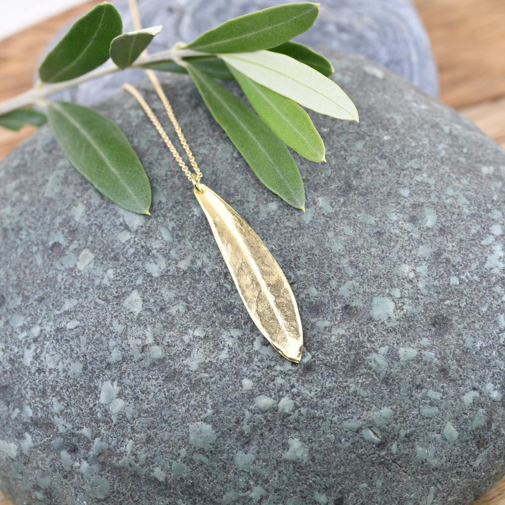 Für die Natur-Schmuckstücke wähle ich besondere Blätter aus. Dieses Oliven-Blatt stammt aus Kalamata! In liebevoller Handarbeit wird in der Werkstatt Feinsilber Schicht für Schicht auf das ausgesuchte Blatt aufgebracht und anschließend gebrannt. Dadurch kann die Blattstruktur bis ins kleinste Detail übertragen und erhalten werden. Jedes Schmuckstück ist ein Unikat!