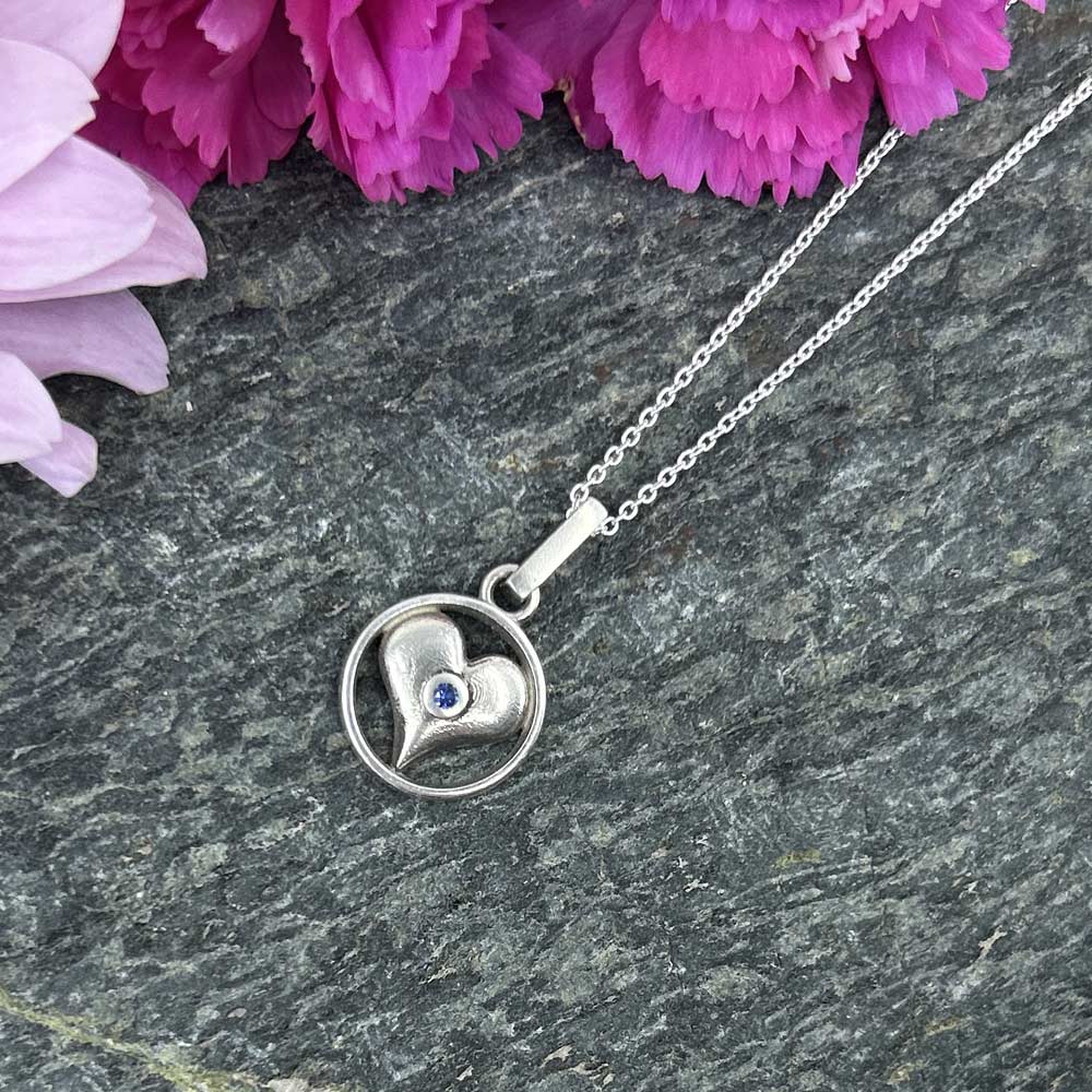 Das kleine Herzchen wird von einer Ronde umschlossen, mittig gefasst ein blau leuchtender Saphir.