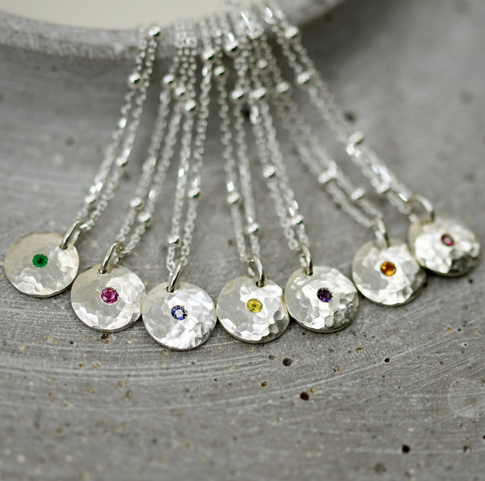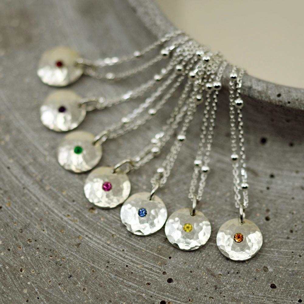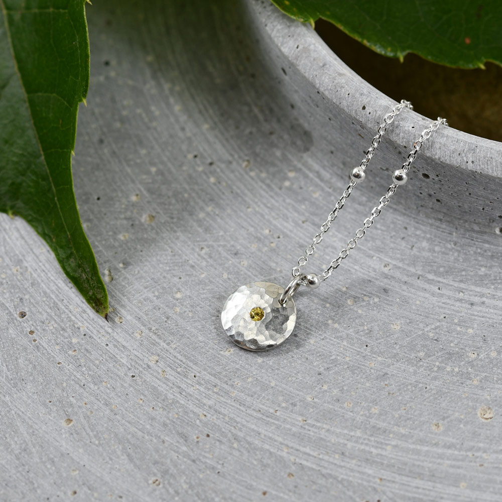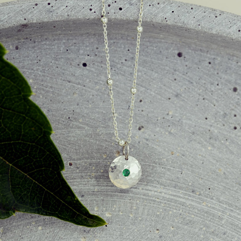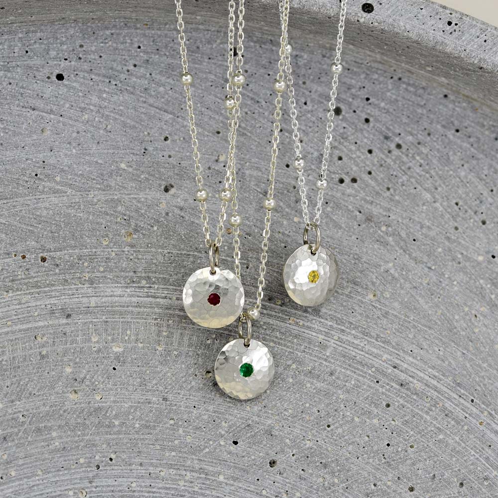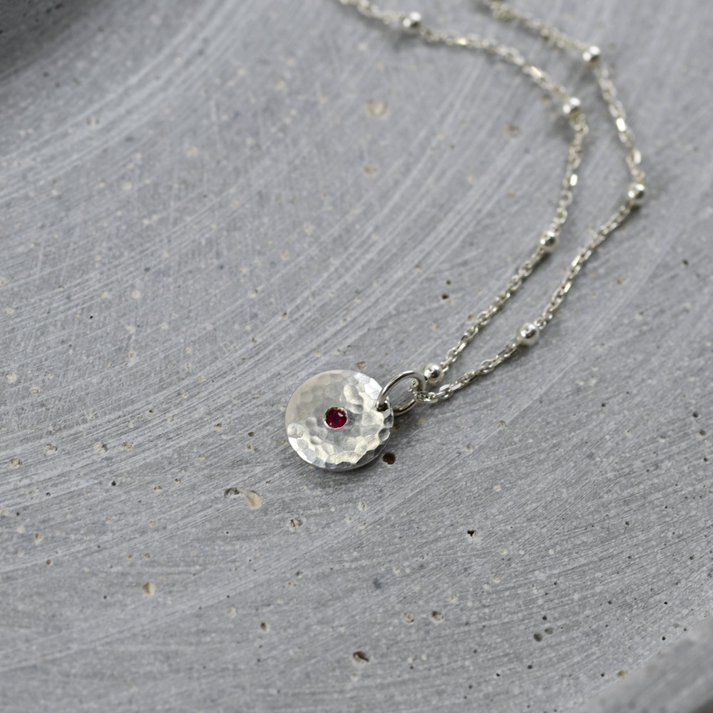 Kleiner Anhänger in Form einer Silberronde, leicht gewölbt, mit einem zentralen Edelstein.
