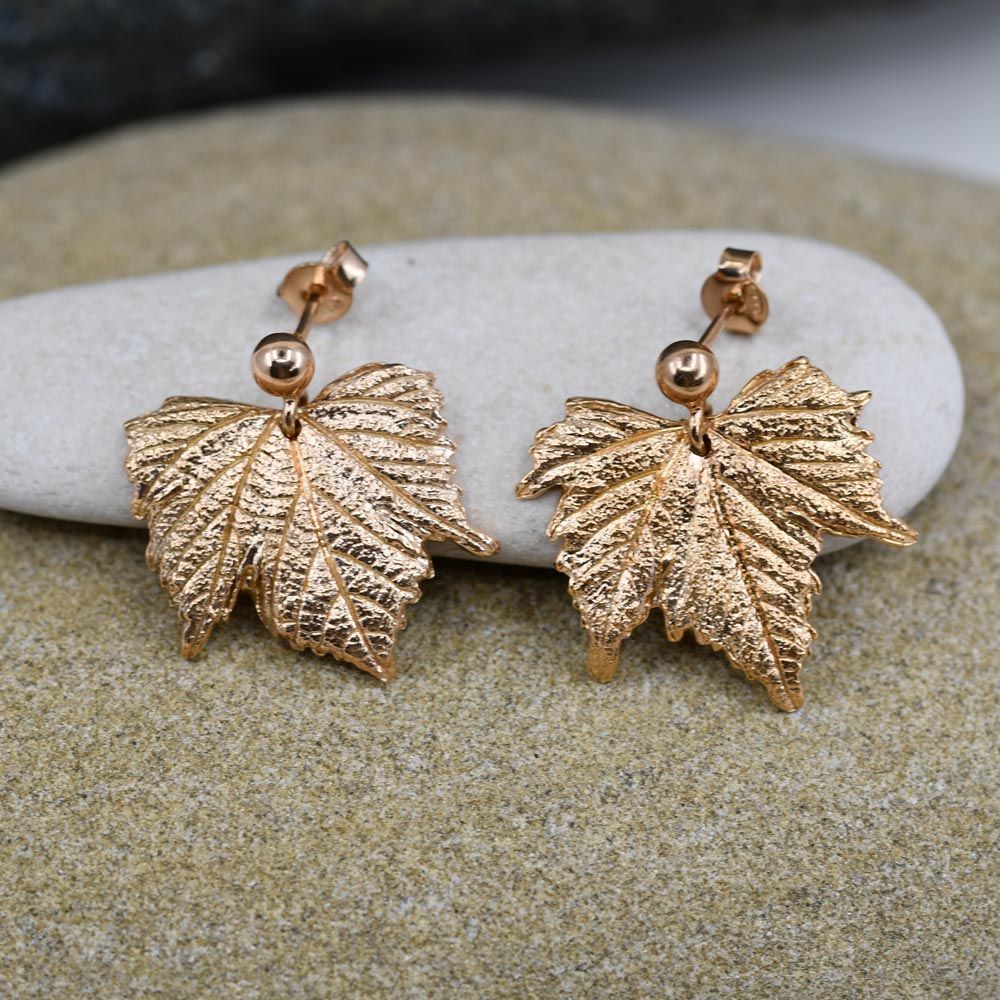 Wein-Blatt Ohrstecker gefertigt in Feinsilber, vergoldet rot.